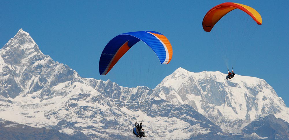 The main area for paragliding is in the Pokhara Valley and recently another area near Kathmandu has become popular. The reason Pokhara is so exciting is the unsurpassed views of three peaks soaring above 8000m, and the magnificent Machapuchchhre 6993m. (Fishtail Mountain). November, December and January are usually the best months for paragliding in Nepal. These months normally have good weather which provides excellent views of the crisp clear Himalayas, the beautiful valleys and the lush jungle. Soaring at 700m or higher you will have an adrenalin rush along with a most memorable scenic vista.